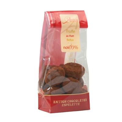 Les truffes sont confectionnées à l’approche des fêtes de Noël dans la plus pure tradition chocolatière. Réhaussées d'une pointe de Rhum, ces ganaches fondantes sont ensuite enrobées de chocolat noir et de poudre de cacao... incontournables et indispensables, conditionnées en poche de 130g. Les chocolats Antton garderont toutes leurs saveurs s'ils sont conservés à l'abri de l'humidité et à une température de 18° à 20°. Pour encore plus de plaisir, dégustez-les sans tarder ! Prix au kg: 78,18 € TTC