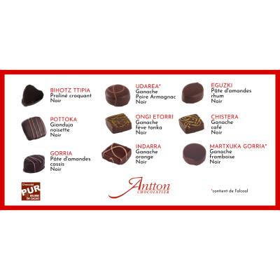 Les ballotins de chocolats de la Chocolaterie Antton vous offrent une palette gourmande de chocolats fins exclusivement au chocolat Noir. Des ganaches fondantes : ganache à la framboise « Martxuka Gorria », ganache au café « Chistera », ganache à la fève tonka « Tonka », ganache à l'orange " Indarra ", ganache à la purée de poire et à l’Armagnac « Udarea » Noir; des pralinés gourmands : gianduja noisette « Pottoka » et praliné amande « Uhaina », praliné noisette croquant « Bihotz Ttipia » Noir, des pâtes d'amandes moelleuses à la pistache « Mendia ».