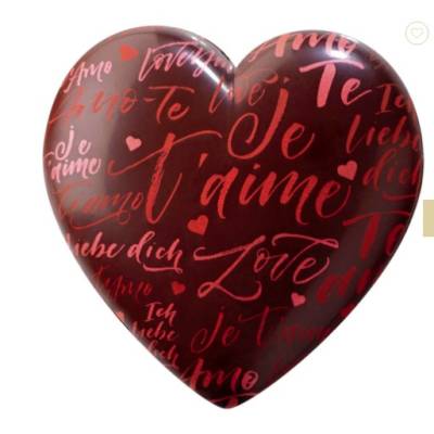 Elaboré à la main, ce moulage en forme de cœur est réalisé en chocolat Noir 70% de cacao. Il est décoré d'un pêle-mêle "Je t'aime".